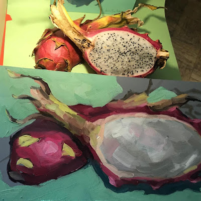 I love this long and thin format. I've used it many times in the past and just rediscovered, (or rather reminded myself) how much I like it #doh. The photo reference, which is square, is from the gracious and talented Sarah Sedwick. It was quite a challenge to figure out how to crop the pic, but I enjoy that part of the process. I think it's important to zoom in, cutting parts of objects off, so the still life doesn't just sit in the centre with a bunch of boring space around it.